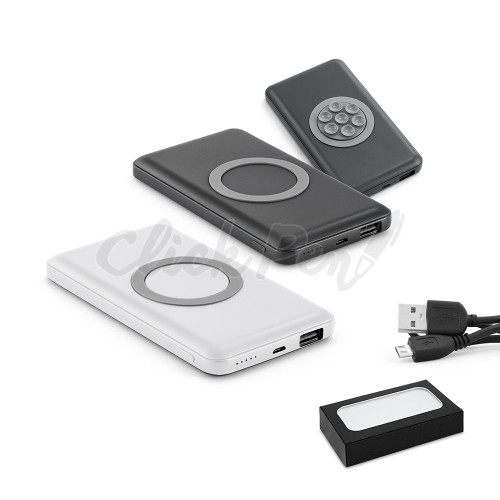 Bateria portátil e carregador wireless. Alumínio. Bateria polímero de lítio. LED: indicador de carga. Capacidade: 4.000 mAh. Entrada 5V/2A e saída 5V/2A. Potência de carregamento: 5W. Incluso cabo USB/micro USB para carregar a bateria. Fornecido em caixa presente. 126 x 71 x 14 mm