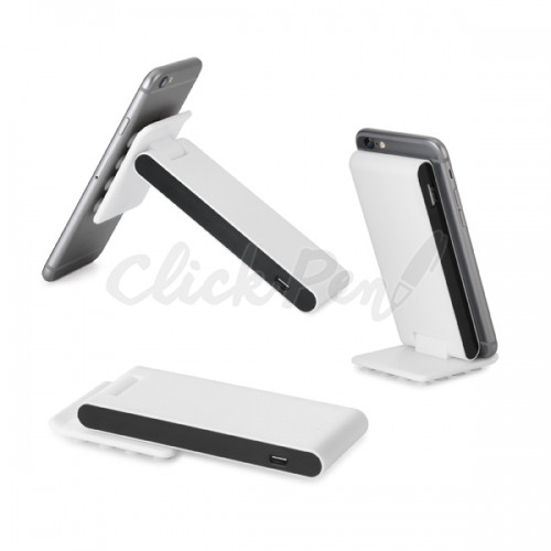 Bateria portátil. ABS. Com ventosas na base. Bateria de lítio. Capacidade: 4.000 mAh. Tempo de vida ≥ 500 ciclos. Com entrada/saída 5V/1A. Incluso cabo USB/micro USB para carregar a bateria. Bateria: 123 x 50 x 14 mm | Base: 65 x 58 x 10 mm