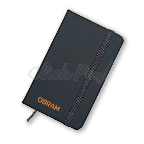 Caderneta brochura tipo moleskine emborrachado com capa dura e marca página, contem aproximadamente 80 folhas pautadas.
