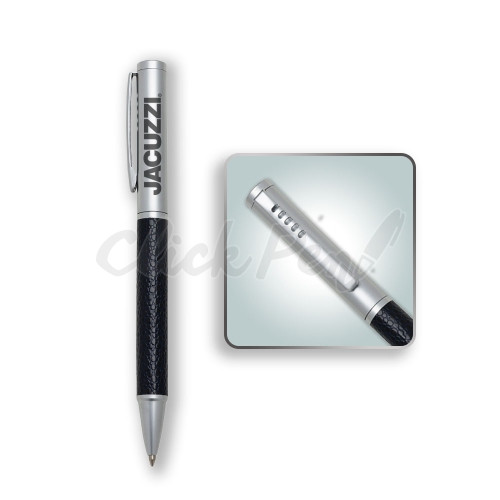 Caneta metal executiva prata com detalhes. Clip metal com cinco furos e aciona por giro.