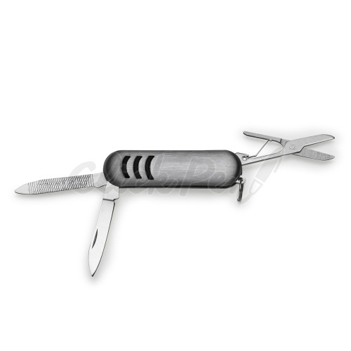 Mini canivete metal 3 funções com detalhes emborrachados preto(três linhas frente e verso). Possui: lixa, lâmina de corte e mini tesoura e acompanha pequena argola para utilizar como chaveiro.