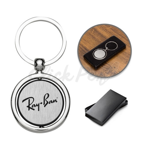 Chaveiro metal giratório redondo. Possui suporte redondo também giratório que segura o chaveiro, chapa redonda giratória ambos lados iguais e com contorno preto.
