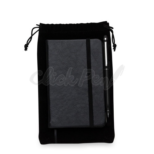 Kit caderneta tipo Moleskine com caneta touch e estojo. Caderneta com capa texturizada e suporte de nylon para caneta, contém marcador de página em cetim e elástico para lacre. Caneta metálica touch screen na cor preta com carga esferográfica azul e acionamento por rotação. Estojo de veludo com cordões de fechamento.