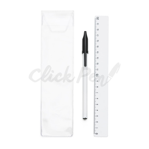 Kit régua e caneta plástica em estojo plástico transparente para personalizar com a sua marca. Caneta simples com tampa e régua de 20cm. Medidas aproximadas para gravação (CxD): Caneta 10,8 cm x 0,5 cm Régua 19,8 cm x 1,5 cm Estojo 18,5 cm x 5 cm Tamanho do produto: Caneta 15,2 cm x 1,4 cm Régua 21 cm x 2,4 cm Estojo 21,6 cm x 5,8 cm