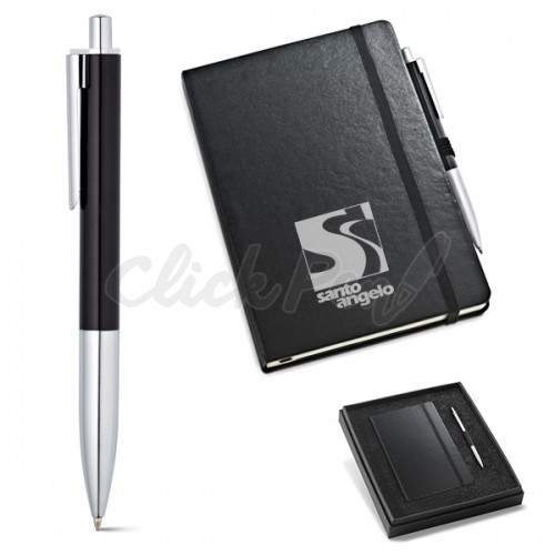 Kit de caderno e esferográfica. Cartão e alumínio. Em caixa almofadada. Incluso caderno e esferográfica.