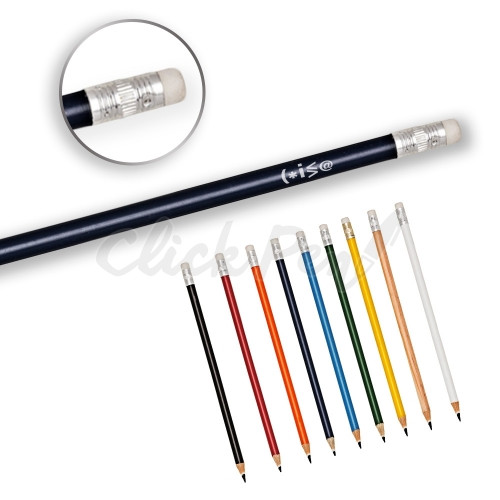 Lápis promocional resinado com borracha, grafite preto e guarnição prateada. Disponível em várias opções de cores e também na cor natural que é madeira de reflorestamento.