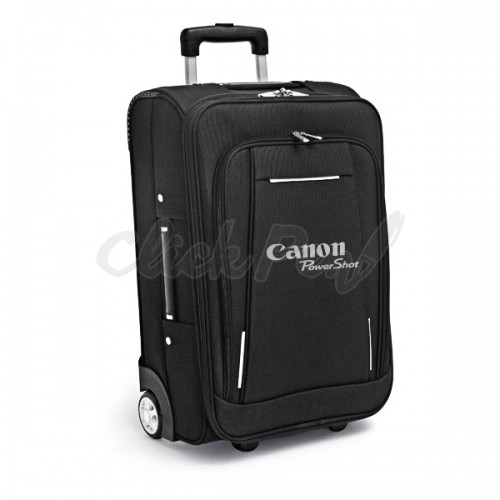 Mala de viagem. 600D e EVA. Com 2 rodas. Compartimento frontal semi-rígido. Interior forrado. Pega extensível em alumínio, com mola (altura da pega estendida: 505 mm).