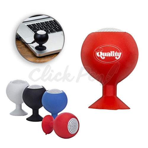 Mini caixa de som ventosa, com bateria interna, 2W de potência, conector P2, acompanha cabo USB para recarga, acabamento emborrachado.