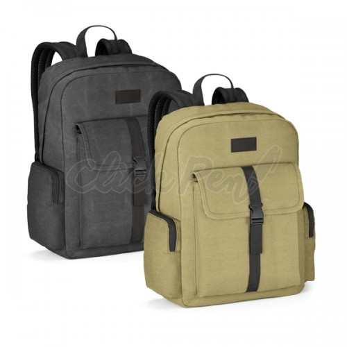 Mochila para notebook. Algodão canvas pré-lavado. Compartimento forrado, com 2 divisórias almofadadas para notebook até 15.6 e tablet 10.5. Bolso frontal e 2 bolsos laterais. Parte posterior e alças almofadadas. Com alça para transporte em trolley e placa em c. sintético para personalização. 300 x 420 x 120 mm | Placa: 60 x 30 mm
