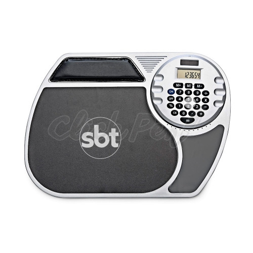 Mouse pad com calculadora plástica. Material plástico prata, mouse pad preto emborrachado com apoio para mão revestido com espuma, calculadora solar de 8 dígitos circular com detalhes em relevo na lateral(acompanha uma bateria L1131) e área plástica em preto para personalização.