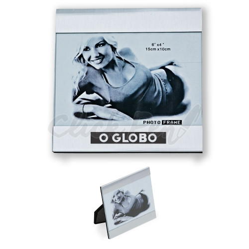 Porta retrato 15 x 10 com duas chapas metálicas(superior e inferior) que podem ser removidas. Possui uma tela de vidro e parte traseira(apoio) revestido de veludo, acompanha película protetora.