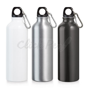 Squeeze 600ml de alumínio com detalhes coloridos e emborrachado. Possui tampa rosqueável em relevo e mosquetão colorido, parte central com borracha colorida em relevo(pode ser removida). Não é térmico.