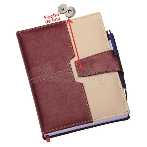 Agenda executiva promocional com fecho de imã e suporte para caneta. Com capa em couro sintético, miolo de agenda diária com 344 páginas, índice telefônico e folhas para planejamento. Com detalhes em costura, é um modelo elegante e discreto, perfeito para gravar com a sua marca.