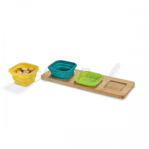 Base de mesa com 3 potes. Bambu e silicone. Incluso caixa de cartão. Dimensões: Potes: 87 x 87 x 50 mm | Base: 300 x 105 x 9 mm | Caixa: 310 x 110 x 28 mm