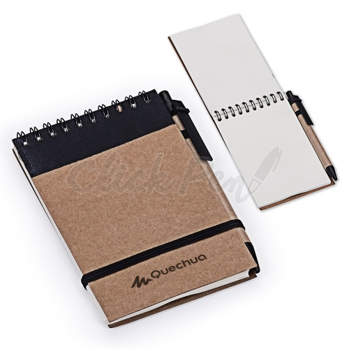 Bloco de anotações ecológico com caneta. Possui uma faixa superior com tecido colorido frontal e espiral preto, suporte elástico para caneta de papelão com clip e ponteira plástico e na parte inferior do verso há o símbolo/escrita recycle. Bloco com aproximadamente 70 folhas amareladas sem pauta.