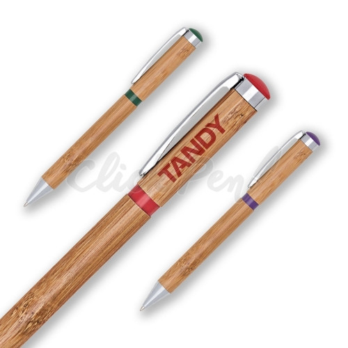 Caneta bambu com detalhes plásticos coloridos no anel e ponta superior. Clip de metal, aciona por giro.