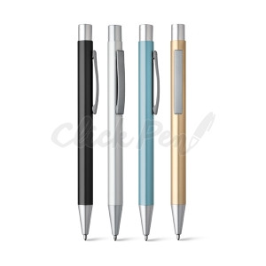 Caneta metal inteira colorida com detalhes prata. Clip metal com dois anéis em relevo, anel centralizado e dois anéis em relevo na ponteira. Aciona por giro.