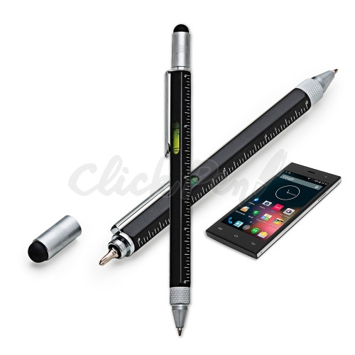 Caneta de metal com paquímetro inteira colorida com detalhes prata. Possui ponteira touch e ao desroquear compartimento prata que sustenta o touch, há uma chave Philips. Clip de metal, possui nível e também é esferográfica, basta girar para acionar.