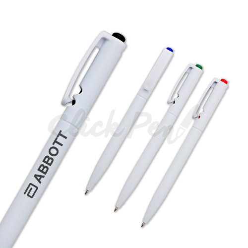 Caneta plástica branca com detalhes coloridos no acionador e destravador. Possui um furo no lado oposto do clip e anel central em relevo. Aciona por clique.