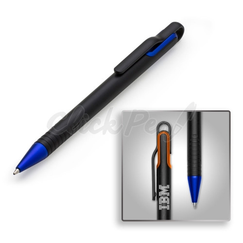 Caneta plástica inteira preta com laterais do acionador colorido. Detalhes em relevo na parte inferior. Aciona por giro.