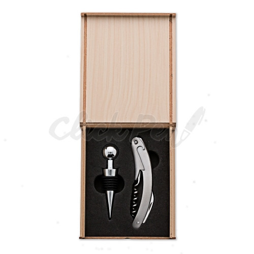 Kit vinho 2 peças em estojo de madeira. Parte interna revestida com espuma, acompanha tampa de bico e saca rolhas.