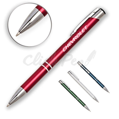 Lapiseira metal inteira colorida com detalhes prata. Clip metal com a ponta do acionador preto, parte inferior com dois anéis prata. Aciona por clique.