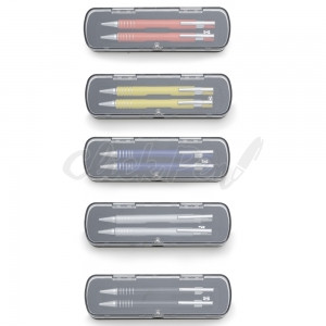 Lapiseira de metal inteira colorida com detalhes prata. Clip de metal com detalhe vazado na parte superior, possui vinte e quatro traços vazados na parte inferior. Aciona por clique, grafite 0,5.