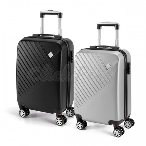 Mala de viagem executivo. ABS. Interior forrado, com divisória. 4 rodas duplas giratórias. Pega extensível em metal, com mola (altura pega estendida até 520 mm). Fecho de segurança com senha. Placa metálica removível, para fácil gravação. Capacidade até 37 L. Peso: 2,50 kg. 355 x 555 x 225 mm | Placa: 29 x 29 mm