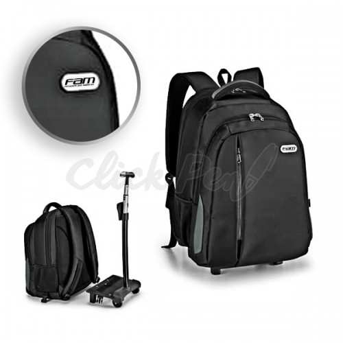 Mochila trolley para notebook. Nylon 999. Material à prova de água. Compartimento principal almofadado para notebook até 17. Segundo compartimento forrado e com diversos bolsos. Bolso frontal com zipper e bolsos laterais com tela. Com estrutura removível e 2 rodas. Pega extensível em alumínio, com mola (altura da pega estendida: 550 mm). 350 x 460 x 210 mm | Chapa: 50 x 20 mm