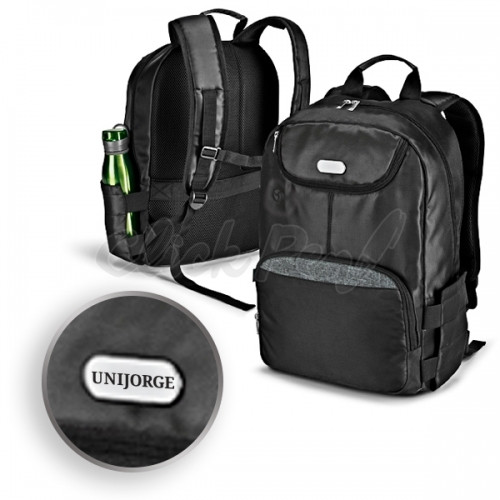 Mochila para notebook. 840D jacquard. 2 compartimentos para notebook até 17 e para tablet 9.7. Interior forrado e parte posterior almofadada. Bolso frontal com porta esferográfica. Com saída para fone de ouvido e alça para transporte em trolley. 330 x 450 x 160 mm | Chapa: 50 x 20 mm