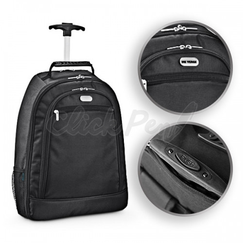 Mochila trolley para notebook. 1680D e 600D. Com 2 rodas. Compartimento principal almofadado para notebook 15.6. Segundo compartimento forrado e com diversos bolsos. Bolso frontal com zipper e bolsos laterais com tela. Com protetor de rodas em poliéster. Pega extensível em alumínio, com mola (altura da pega estendida: 530 mm). 350 x 490 x 140 mm | Chapa: 50 x 20 mm