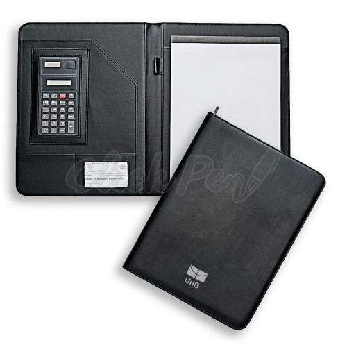 Pasta convenção de couro sintético, possui calculadora solar plástica de 8 dígitos, suporte para cartão, suporte com visor para cartão de identificação, suporte para arquivar documentos, suporte para caneta(não acompanha caneta) e bloco com 20 folhas pautadas.
