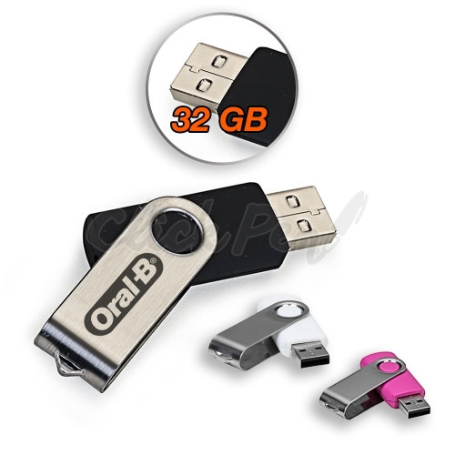 Pen drive de metal giratório 32gb, parte interna preta em plástico resistente. Possui uma “argola” na parte em metal que poderá ser utilizado para colocar algum cordão.